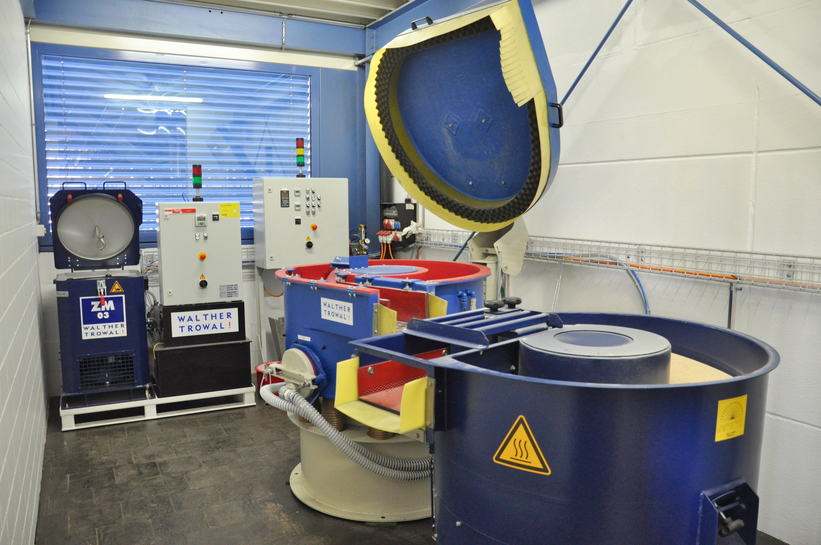 Gleitschleifen, auch Trowalisieren genannt, ist das effizienteste Verfahren, um Kleinteile zu entgraten. Wir erneuern unsere Anlage mit dem neuesten Modell, ergänzt mit einem Trockner und einer Zentrifugenanlage zur Wasseraufbereitung.